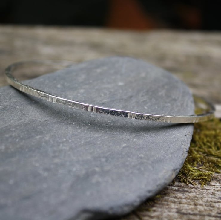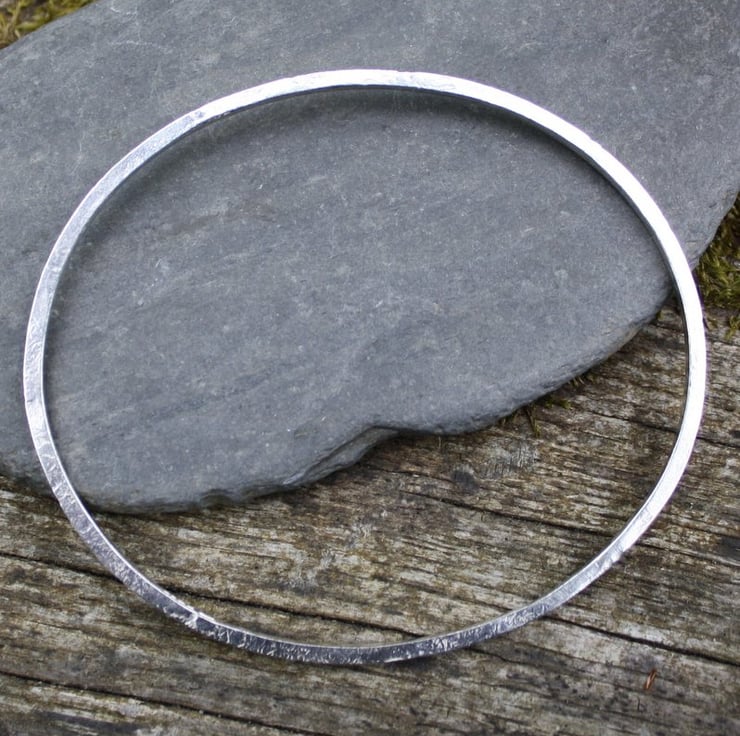 This bangle is quite fine, it is made from square section sterling silver which has been hammered and beaten to add texture and form it into an oval bangle.