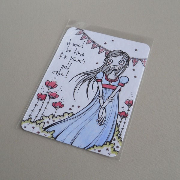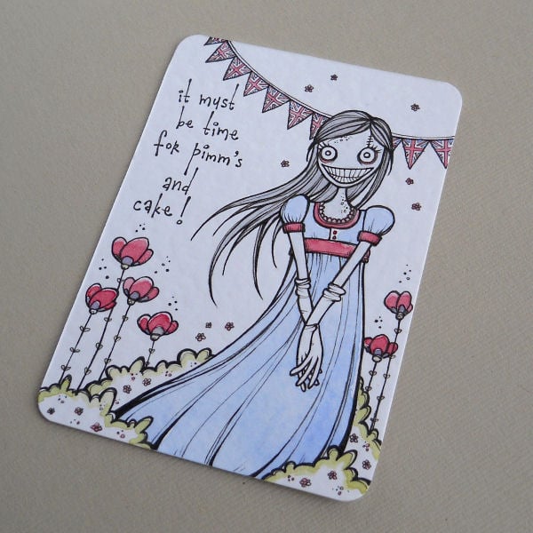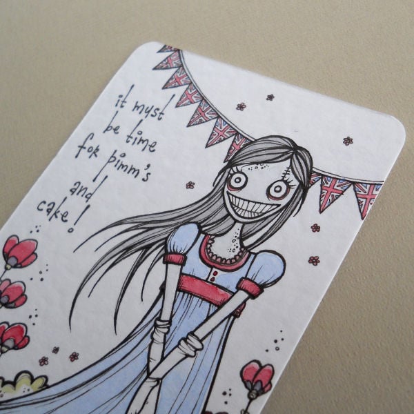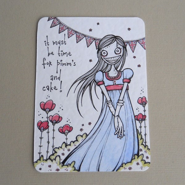 this little zombie is so excited about the diamond jubilee. she can't wait to put brains aside in favour of pimm's and cake! she's even got her dainty white gloves on, and has hung out some patriotic union jack bunting, too! she just loves the best of british!