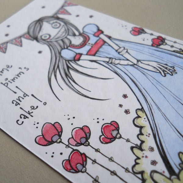 this is an original artwork in artists pens and watercolour paints, on textured white card.