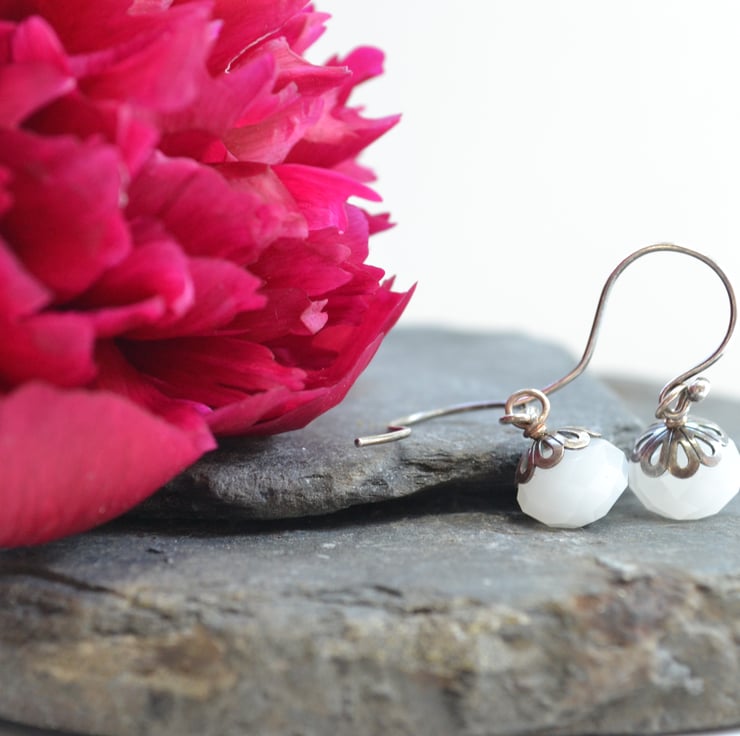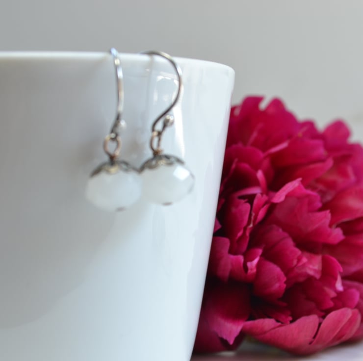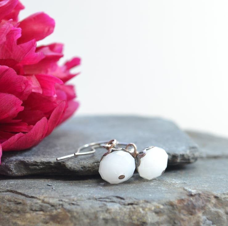 Cloudy, milky white facetted glass beads are paired with an oxidised sterling silver bead cap, and dangle from handforged sterling silver oxidised earwires.