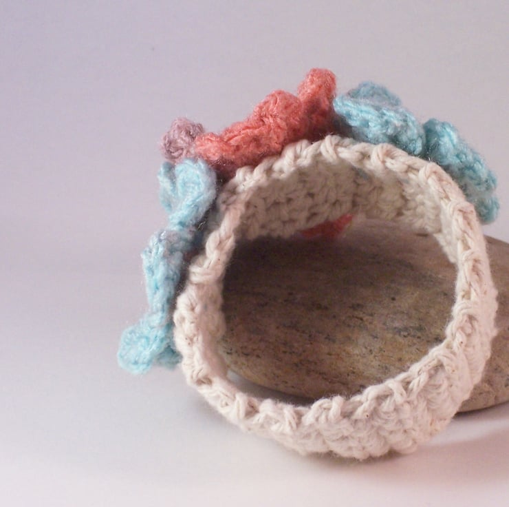 Annys cuff in cotton yarn with three hand crochet flowers.