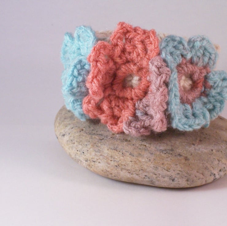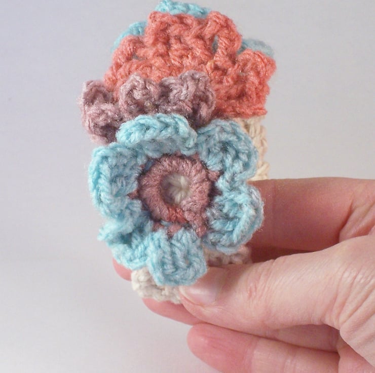 Crochet cuff with three floral blooms in aqua, peach and mauve