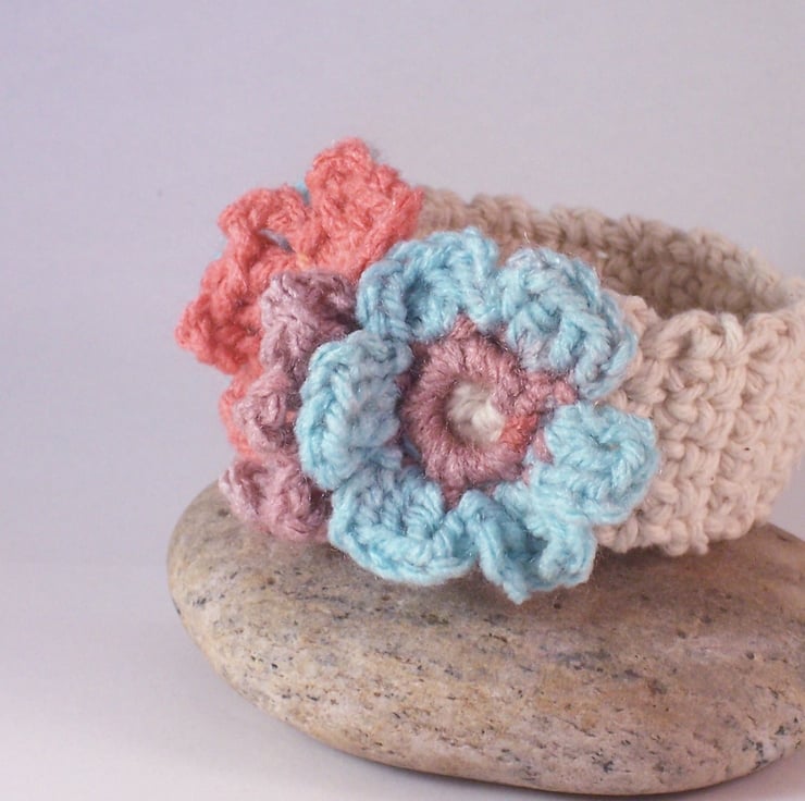 Annys cuff in cotton yarn with three hand crochet flowers.