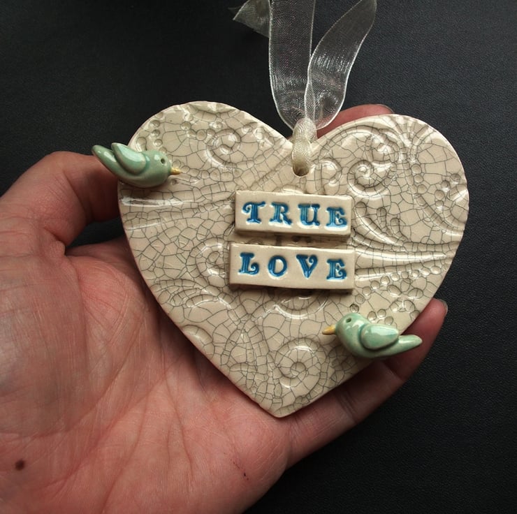 This ceramic heart is made from white earthenware clay and decorated with the two little blue birds and the word s TRUE LOVE.