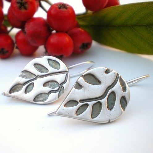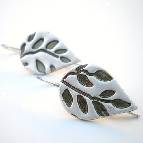 These earings are leaf shaped and have a leaf and twig pattern. The pattern has been given a dark patina and really stands out. I finished the earrings with a light coat of jewellers wax to protect the patina.