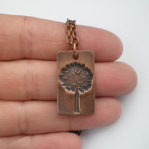 The pendant measures 1.8cm x 2.5cm and is hung on an antiqued copper chain, closed with a simple handmade hook clasp. The copper has been given a deep patina and then polished up to make the tree really stand out. Finally I coat the copper with jeweller's lacquer to protect against discolouration.
