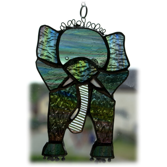 The suncatcher hangs from a little chain which is securely attached to the top of the elephant. It is 5.5 inches tall.