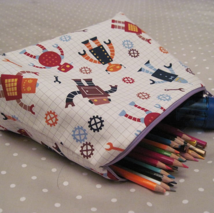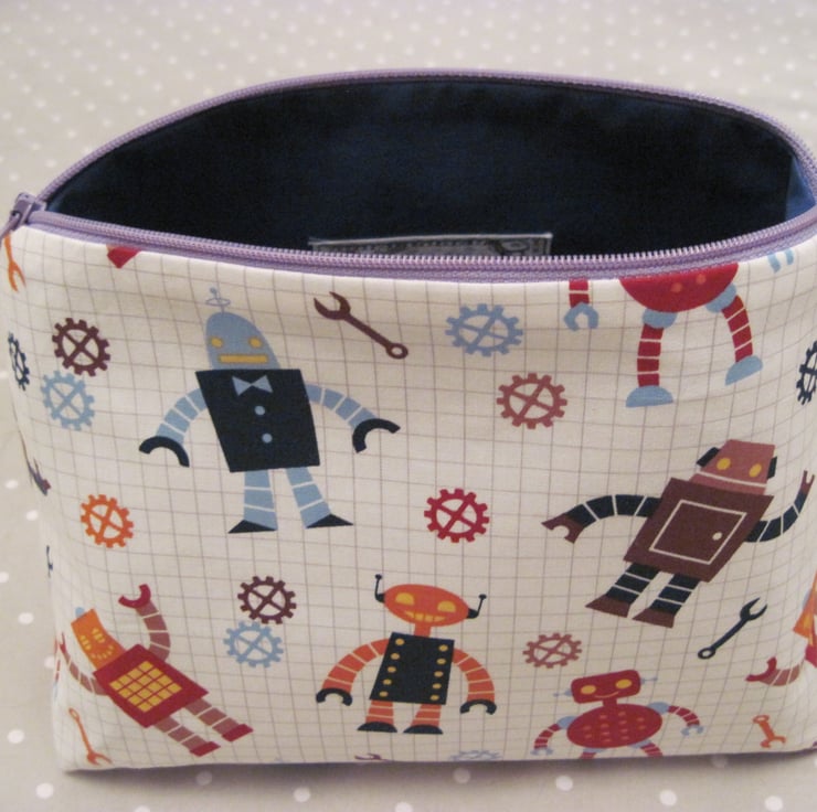 This lovely fabric case is made from a cotton outer fabric in shades of blue, red, white etc with an all over 'robot' print . There is a purple zip closure and the lining is made from a deep blue cotton fabric. The fabric used for the case has been interfaced to give it structure.