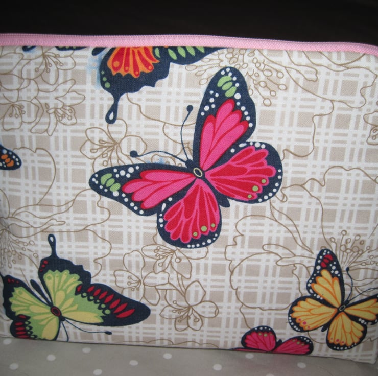 This lovely fabric case is made from a cotton outer fabric in various shades with an all over butterfly print . There is a pale pink zip closure and the lining is made from a vibrant pink and white polka dot cotton fabric. The fabric used for the case has been interfaced and padded to give it structure and a feel of softness and luxury.