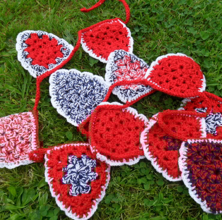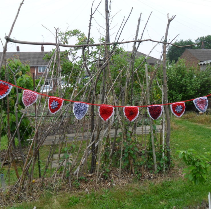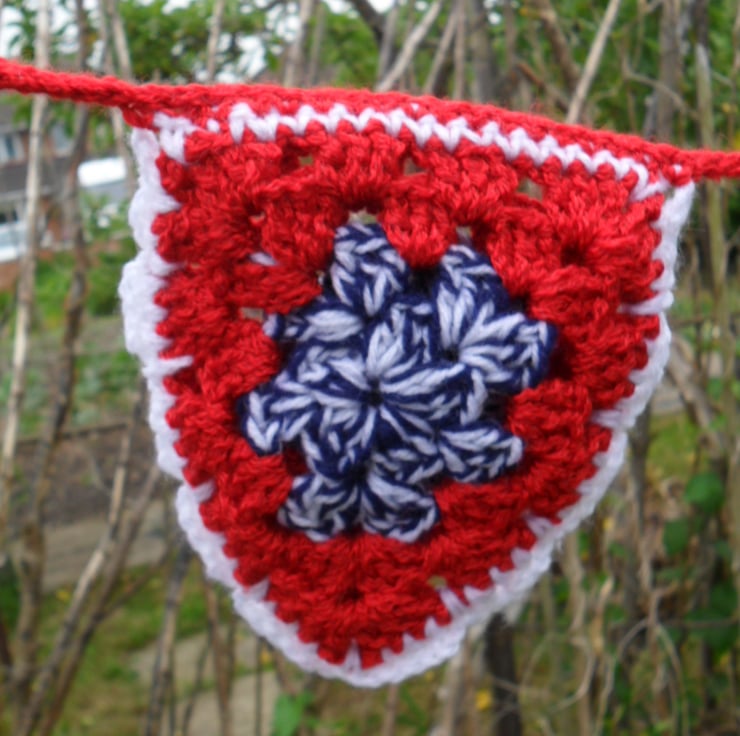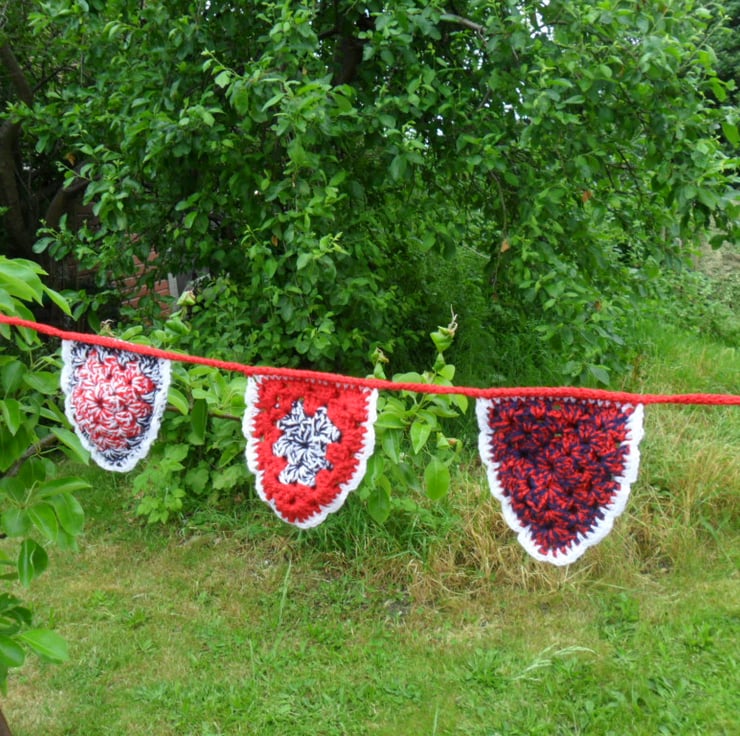 The yarn used to create this lovely string of red, blue and white bunting is 100% acrylic yarn.
