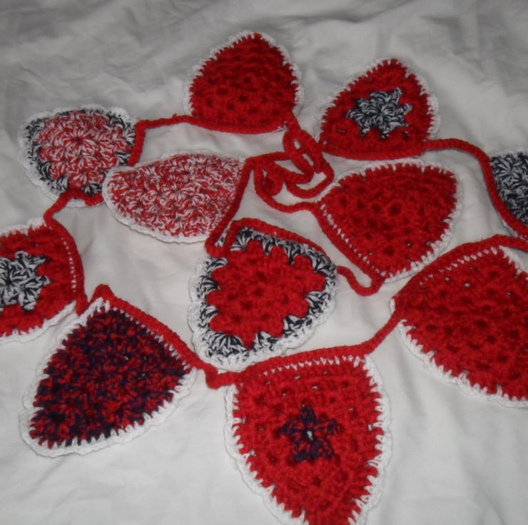 A length of crocheted bunting in red, blue and white. Each triangle has been created in crochet. The triangles have then been crochet together to form a string of bunting in red. Each triangle has been finished in a border of white crochet. There are eleven crochet triangles which make up this string of bunting.