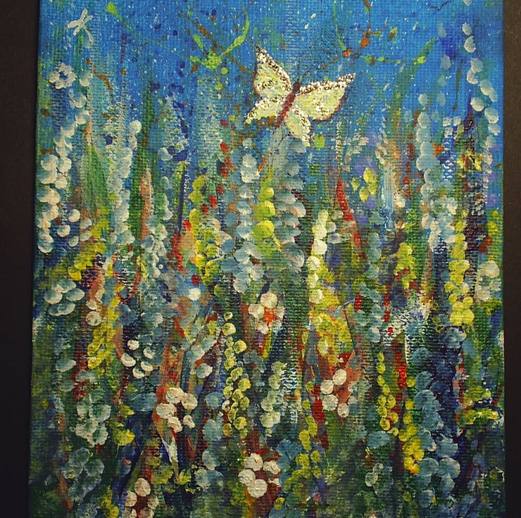 A 7" x 5" acrylic painting on canvas board. Ready for framing, this painting has been created using quality materials. It will come in a clear polybag to protect it. This is an original and not a print. The butterfly has delicate glitter on its wings......