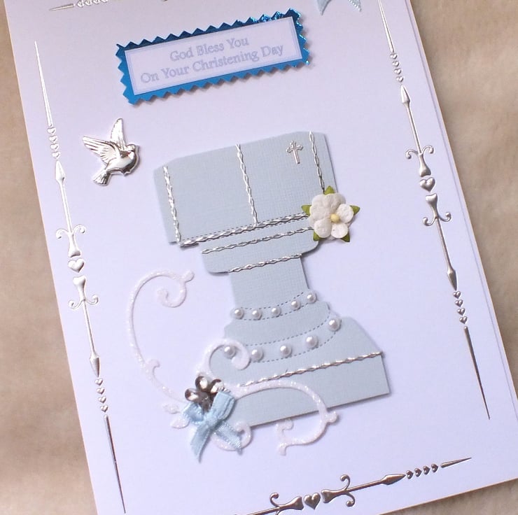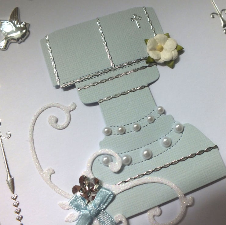 Luxury handmade, size A5, Christening card, embellished with font, flourish, bows, silver dove, flowers and faux pearls, with 'Congratulations on your Christening' sentiments inside.