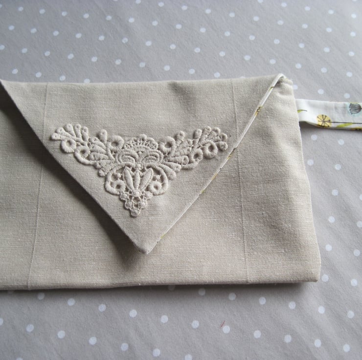 This case has a cotton embroidered decoration on the envelope front.