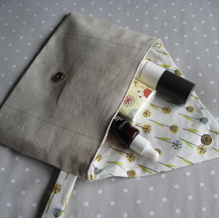 The case is made from a beige linen cotton fabric and has a 100% certified organic cotton 'My Happy Garden' lining. It has been interfaced to give it a nice firm but soft structure. Their is a handy strap and a gold magnetic fastener to keep it all safe and snug inside.
