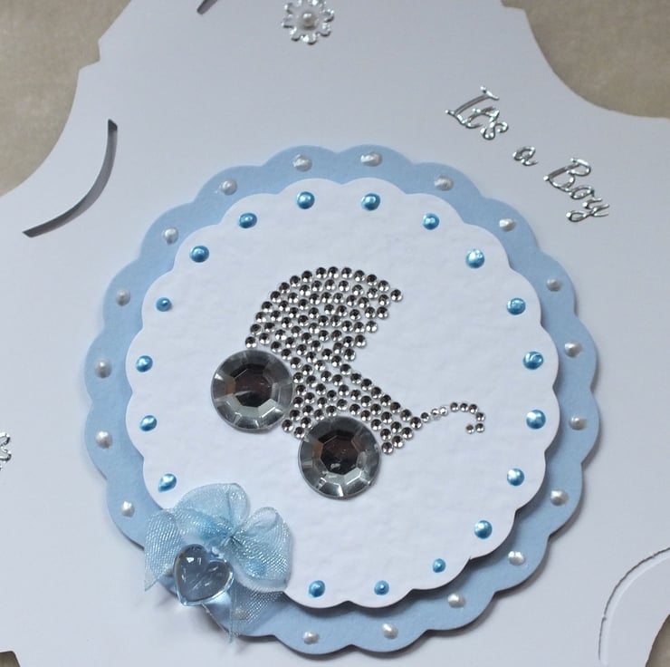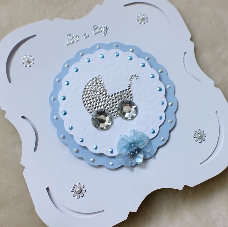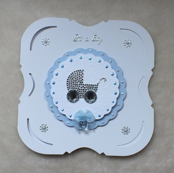 Luxury handmade 'It's a Boy' card, size 6"x6" pretty die-cut shaped, embellished with attractive diamante pram and drop heart gem bow, with 'Congratulations' sentiment inside.