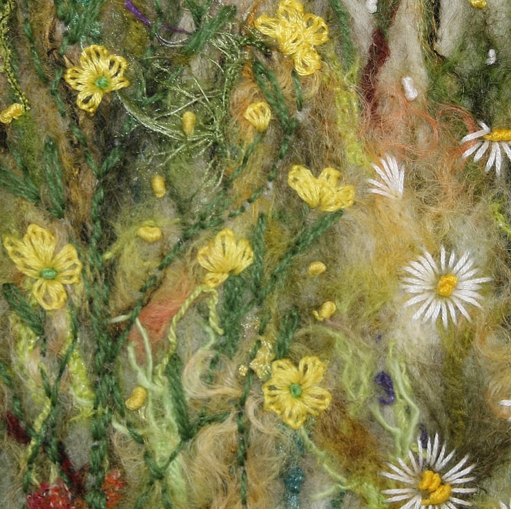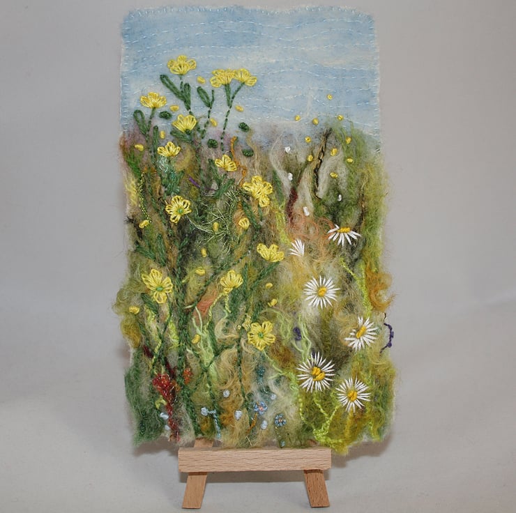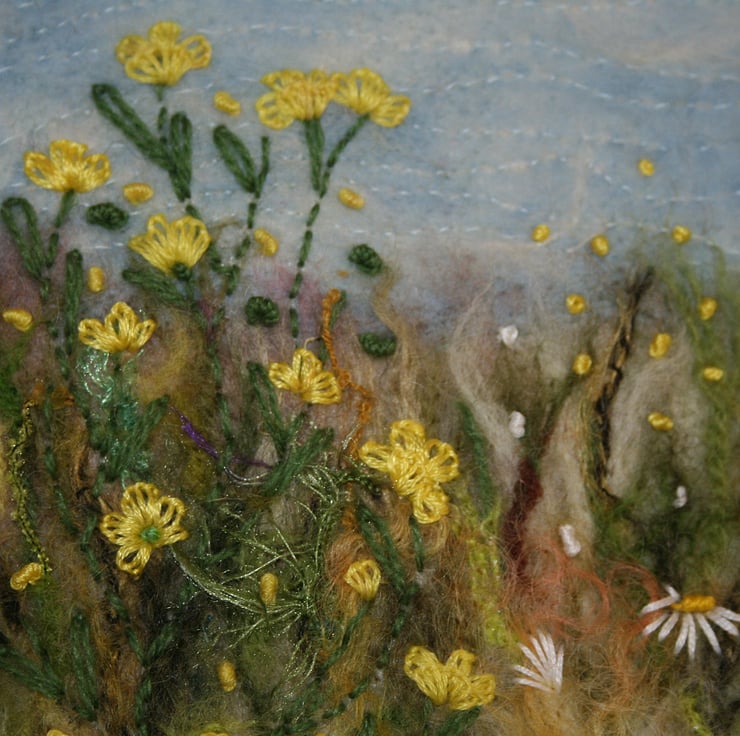 Sky blue wool fibers have been felted to a background of kunin felt (produced from recycled plastic bottles) using an embellisher machine. A wide variety of yarn snippets, carefully collected from other yarn projects, have been added to represent the meadow grasses. Stitching in fine cotton has been added to the sky and meadows to 'stabilise' the felting. Buttercups, daisies and speedwell are then added in embroidery threads using simple stitches.