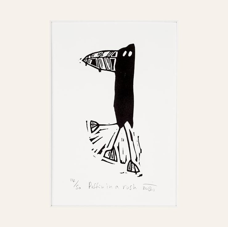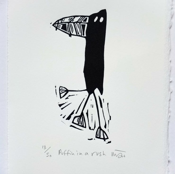 This is a black and white lino print showing a puffin in a tearing hurry...