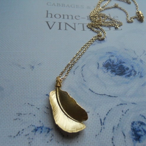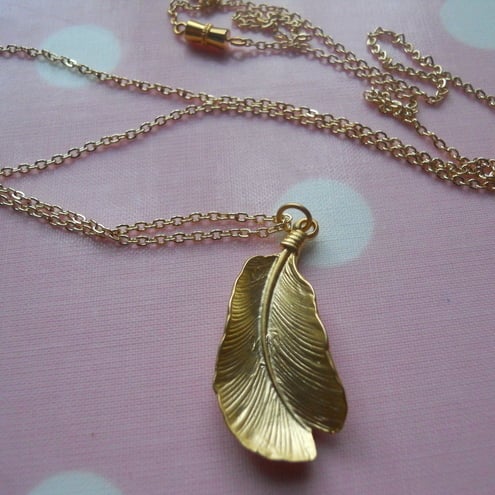 This is a lovely gold plated large pewter Feather necklace on a long gold plated chain. The feather measures 18 x 36mm. The chain is about 28 inches but can be made shorter if preferred.