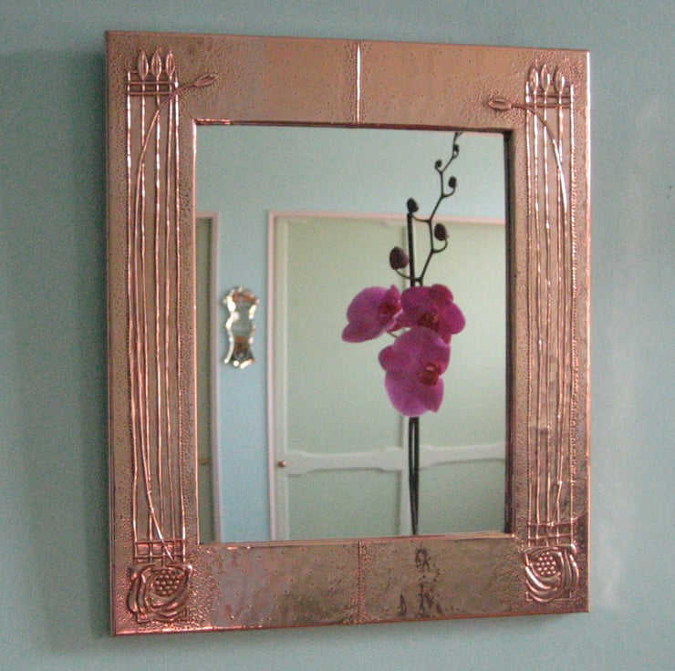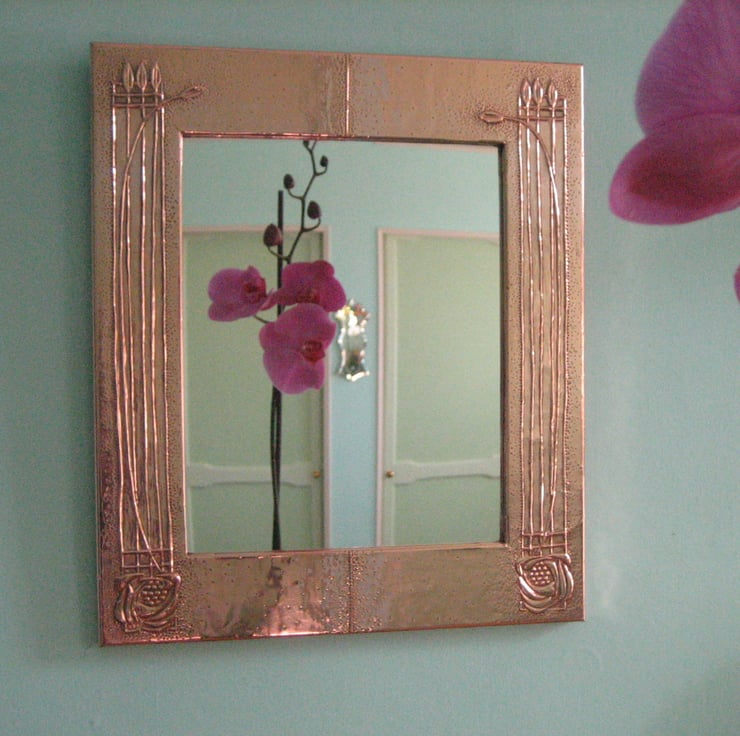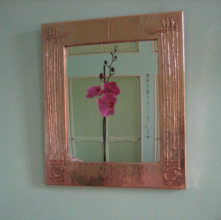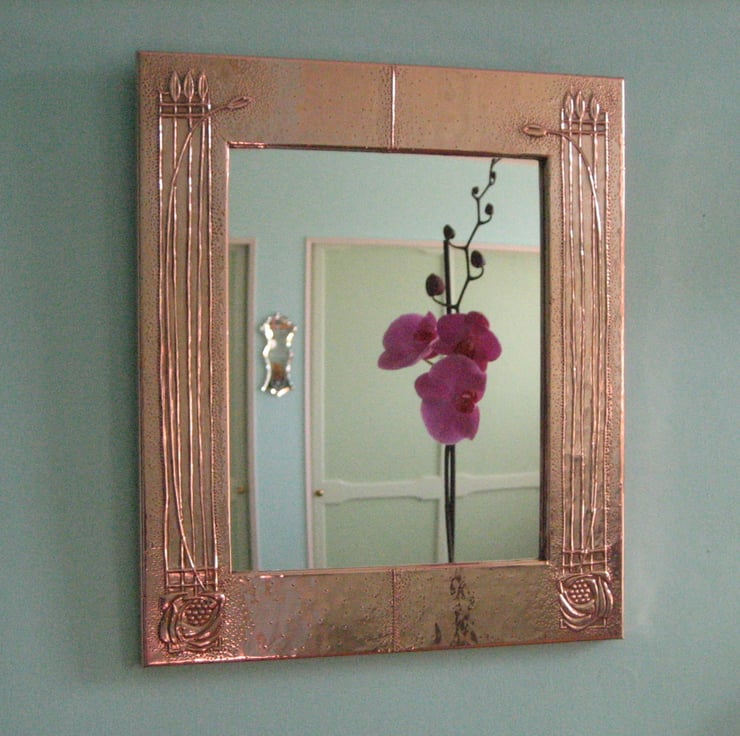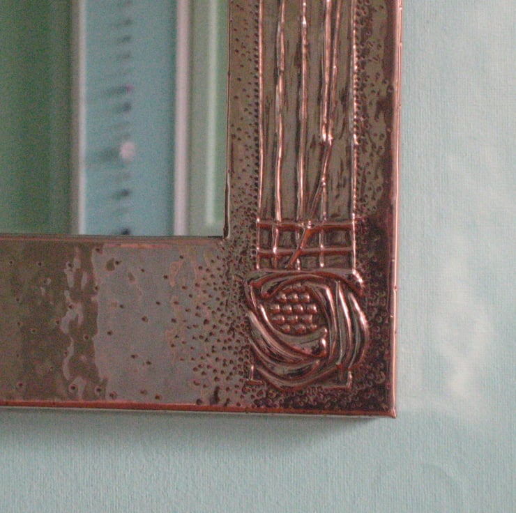 This beautiful mirror has been handmade in the Arts and Crafts tradition.The design comprises elements of the work of Charles Rennie Mackintosh and the copper has been patinated and polished to a rich finish. Overall size 345 x 294mm (13.5 x 11.5ins