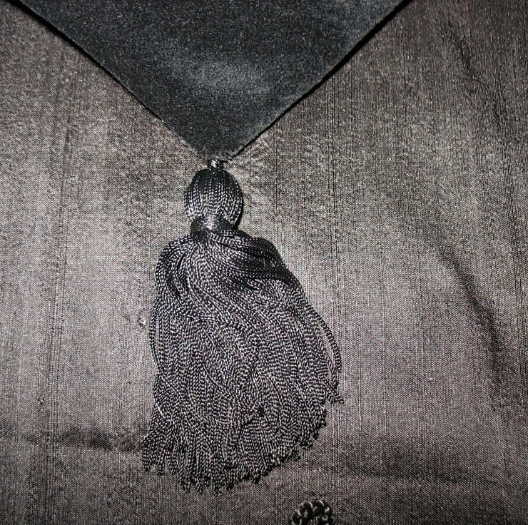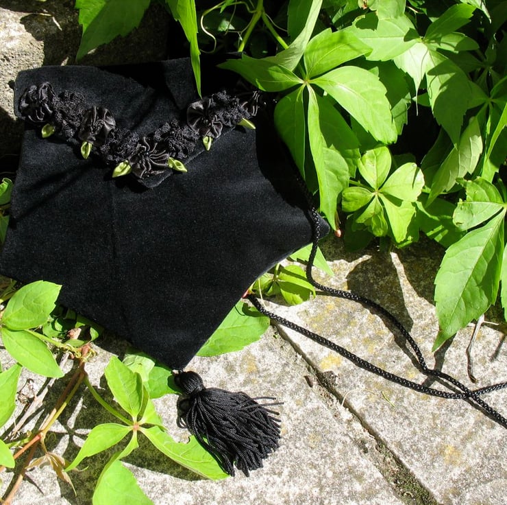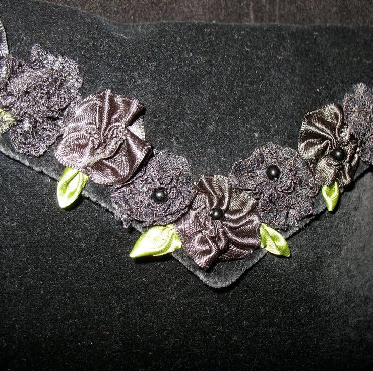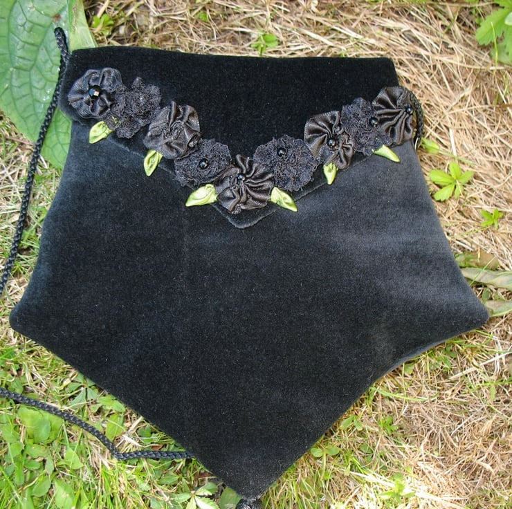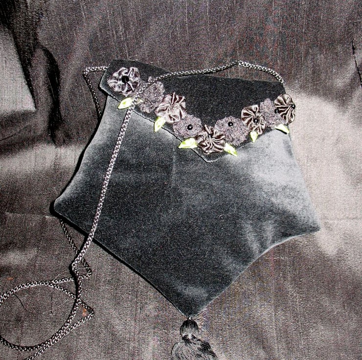 It is decorated with hand made ribbon and lace and glass bead flowers and ribbon leaves and is lined with jet black 100% dupion silk. The cord strap makes it easy to wear over the shoulder and the tassel at the bottom adds that little bit of decadence!