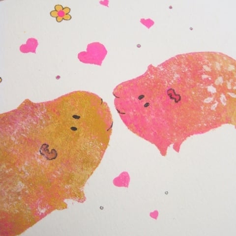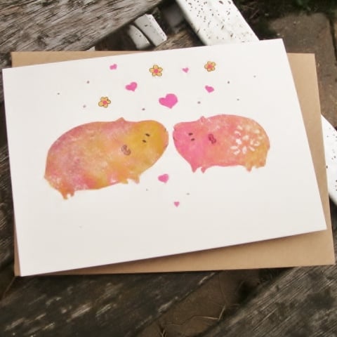 Another of my original design, wedding celebration cards. This cute guinea pig design is hand-painted using stenciling and made with recycled card and envelopes. This design is A6 size and presented with a smarty manilla envelope in a biodegradable clear sleeve.