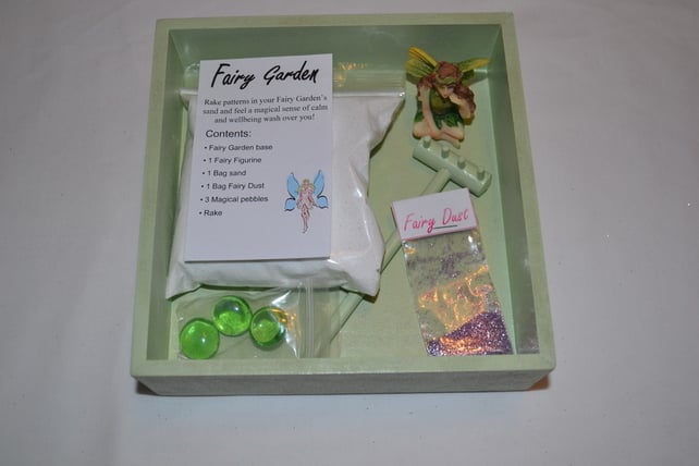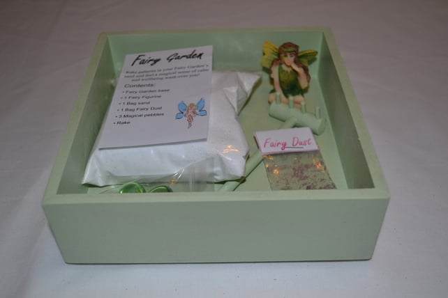These delightful fairy gardens consist of a handmade wooden base with feet (available in a range of colours), which comes complete with beautiful fairy figurine, packet of pure white sand, packet of fairy dust, 3 magical pebbles and mini rake for raking your sand. Dimensions: 17cm x 17cm x 5.5cm (H). This fairy garden makes a unique and special Christmas gift.