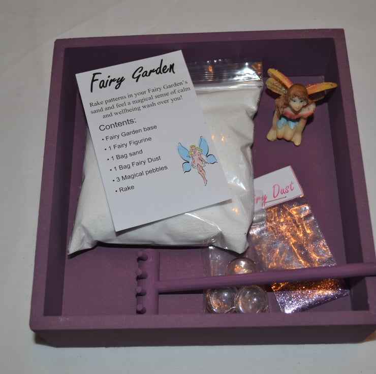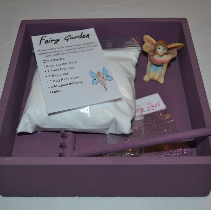 These delightful fairy gardens consist of a handmade wooden base with feet (available in a range of colours), which comes complete with beautiful fairy figurine, packet of pure white sand, packet of fairy dust, 3 magical pebbles and mini rake for raking your sand. Dimensions: 17cm x 17cm x 5.5cm (H). This fairy garden makes a unique and special Christmas gift.