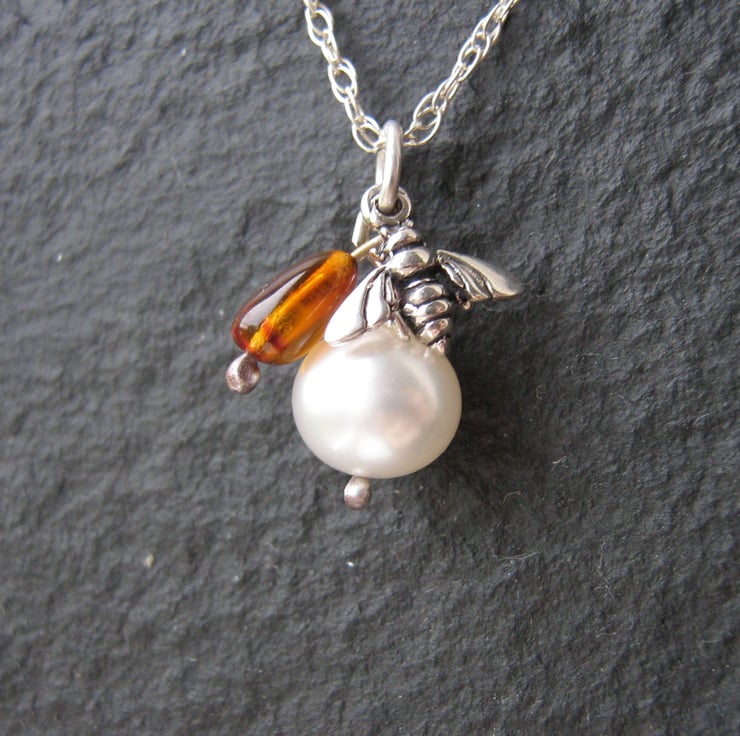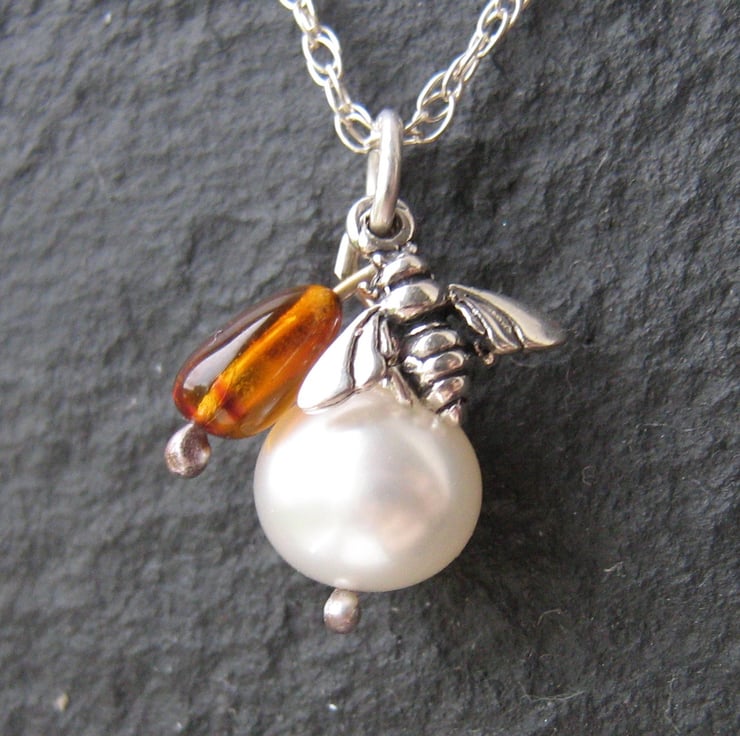 A lovely little necklace featuring a sterling silver bee charm (10mm) perching beside an ivory freshwater pearl and a bead of genuine amber. The overall drop of the pendant is just 20mm, and is hung from a sterling silver chain (either 16 or 18", please state preference upon purchase). A perfect gift for nature lovers of just admirers of handmade jewellery.