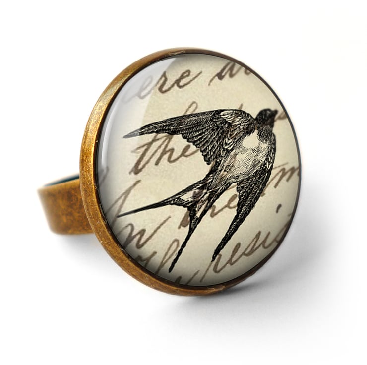 A gorgeous ring featuring an image of a swallow taken from a Victorian book illustration, combined with a script background. This design is part of the 'Eclectic Range'.