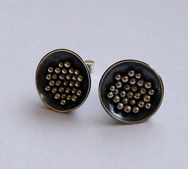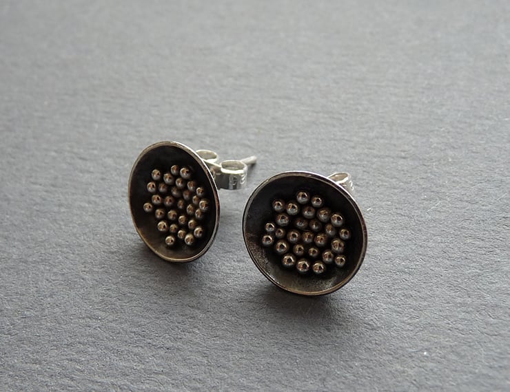 These domed earrings are made of sterling silver, using an ancient technique called granulation. Each ball has been formed individually and then soldered to the piece.