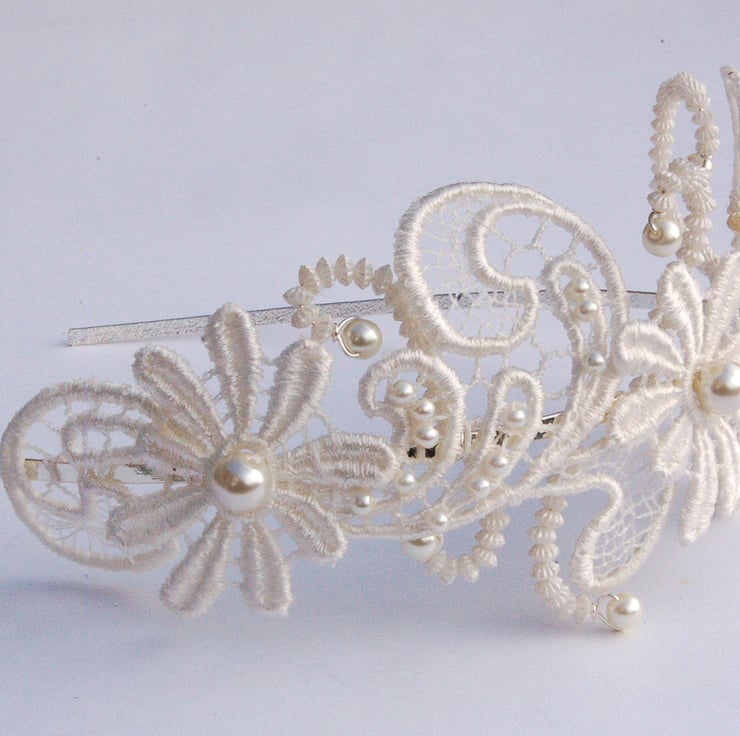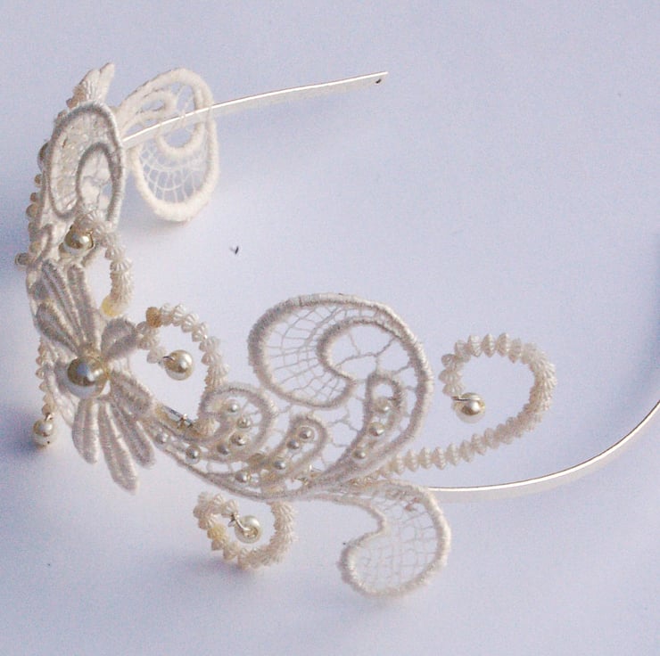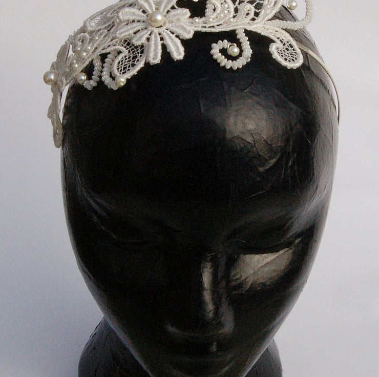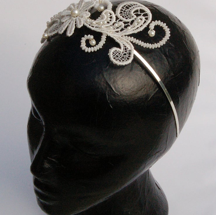 The lace has been stiffened to sit firmly on the silver plated hair band which can be worn forwards on the head for a vintage look or further back depending on the hair style.