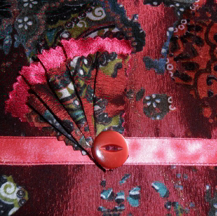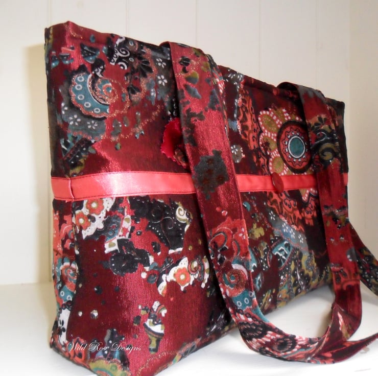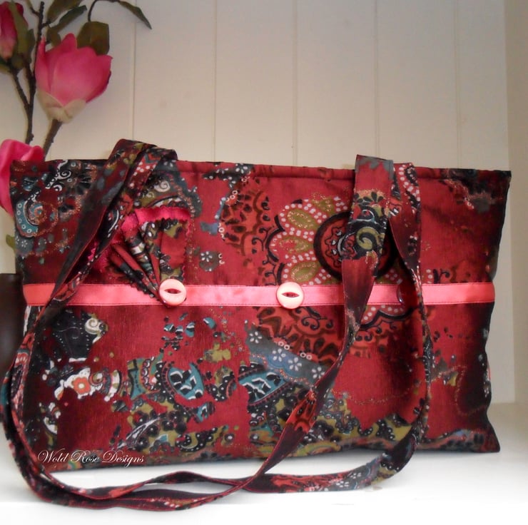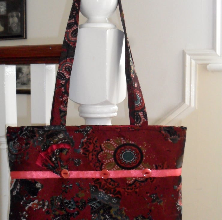 This tote style handmade handbag is made in a red flocked brocade, trimmed with a coordinating ribbon, buttons and a fabric 'fan'. The handles are in the same brocade and are long enough to fit comfortably over the shoulder.
