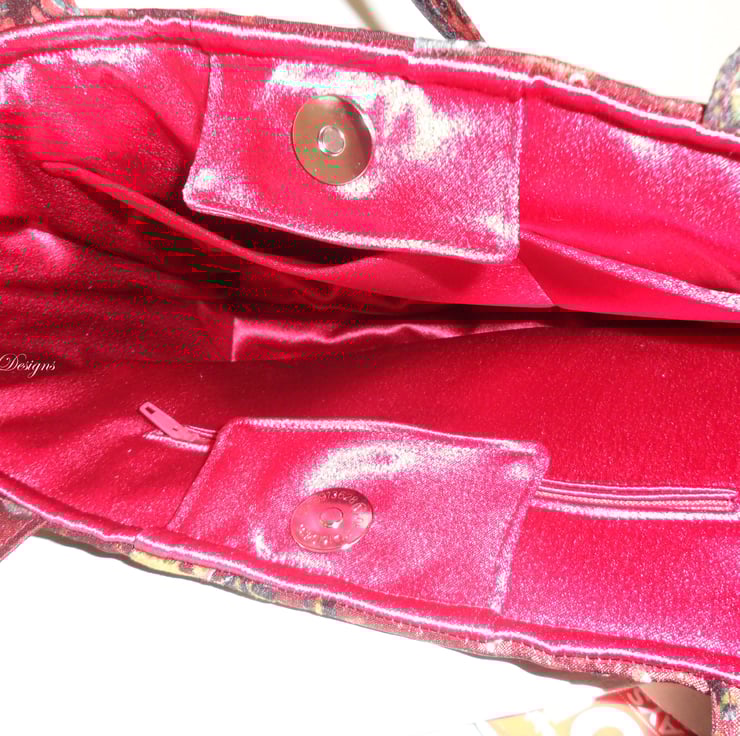 Inside, the lining is a lovely red crepe satin and there are two pockets; a zipped pocket and a divided slip pocket. The bag closes with a magnetic snap.