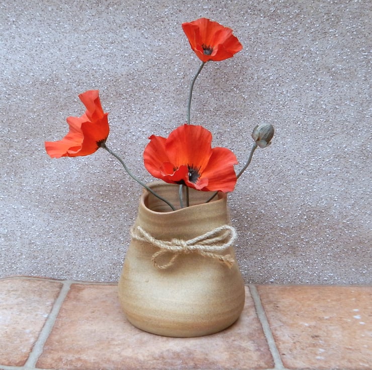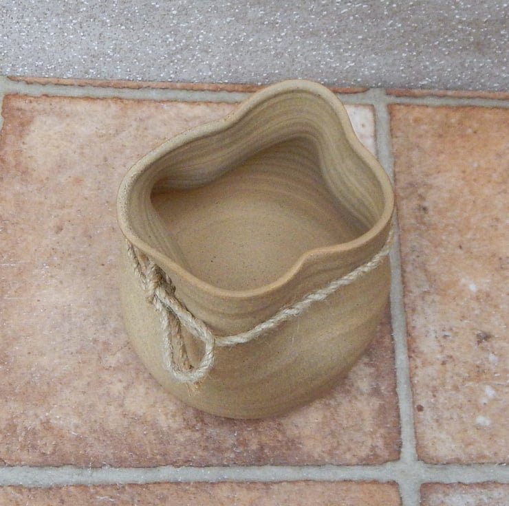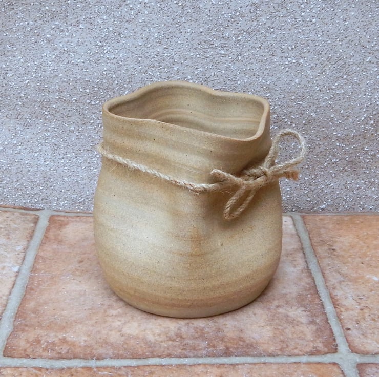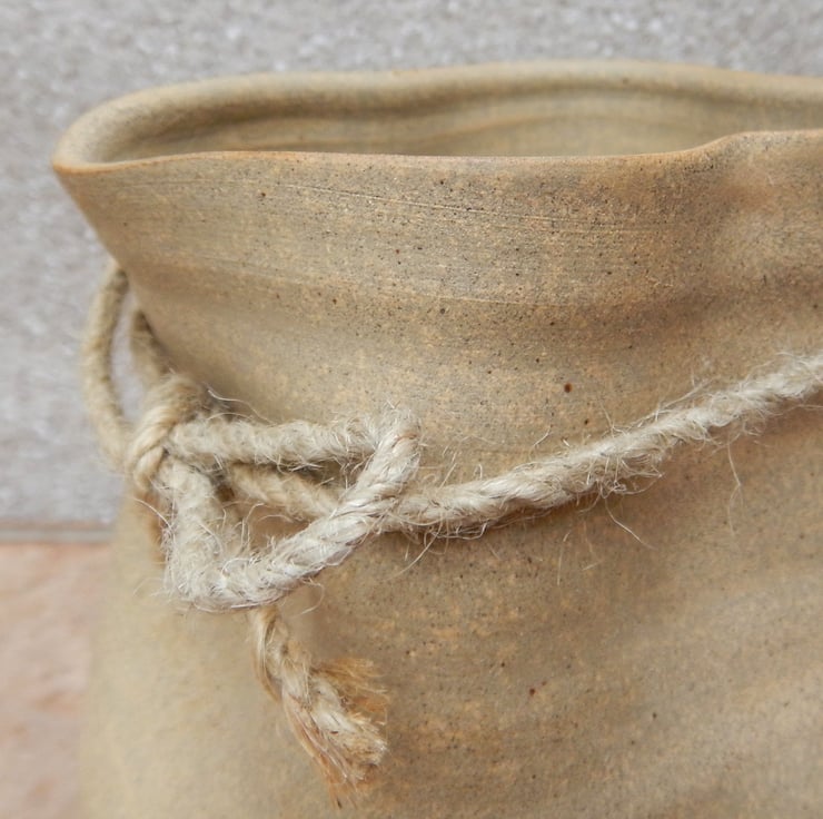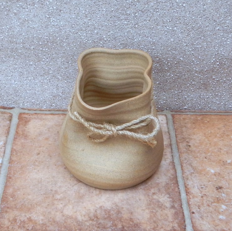 I threw this vase on my pottery wheel using strong toasted stoneware clay and altered into a crumpled paper bag shape.