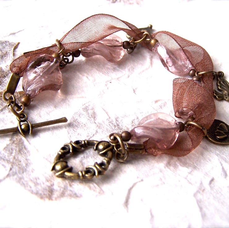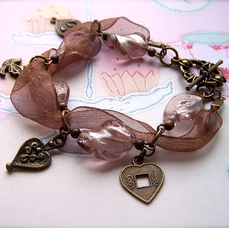 I wove a beautiful plum / coffee coloured ribbon around a string of pale pink beads, then added the brass charms.