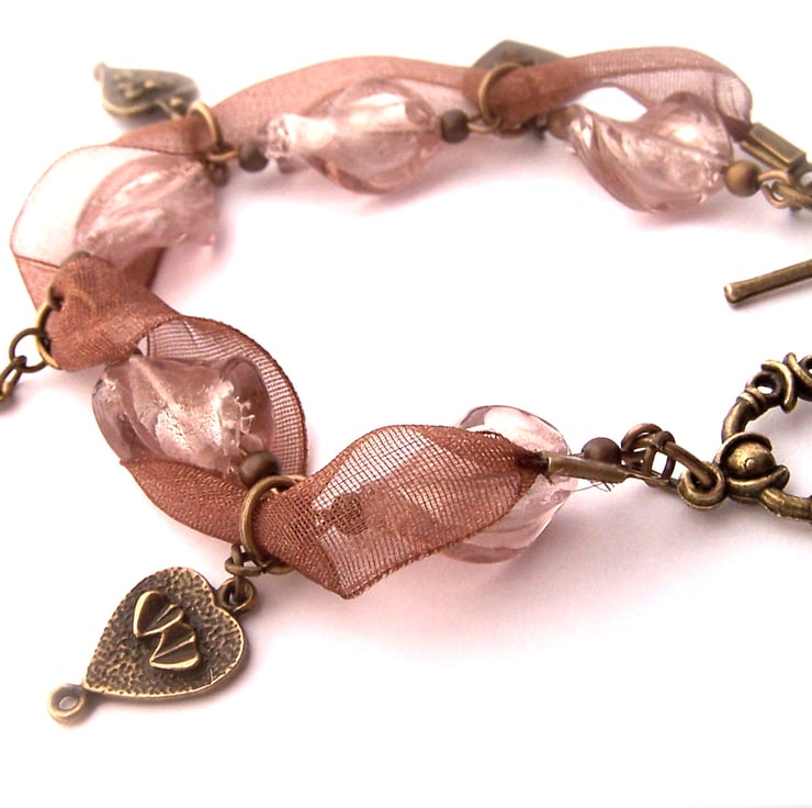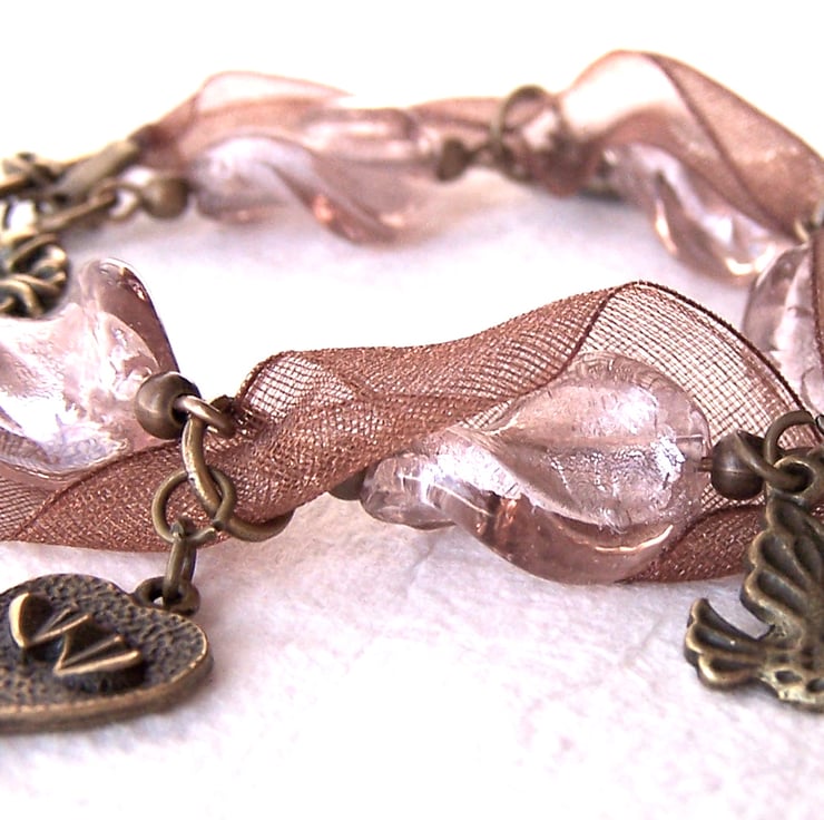 Ribbon Bracelet, Brass Charm Bracelet, Boho Style, Heart, Bird