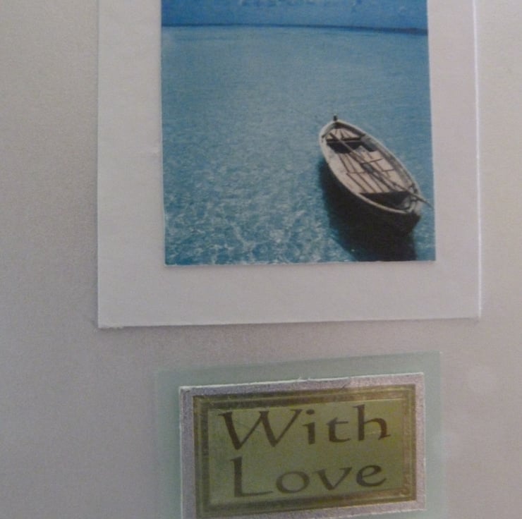 A romantic rowing boat drifting in the blue sea, mounted onto a square of white hammered card and then mounted onto a silver pearl card. All enclosed by a pale green plastic outer card which has had a centre square cut out to allow the picture of the boat to show through. With best wishes printed in gold surrounds the insert. A With Love embellishment mounted onto green plastic mounted under the boat..