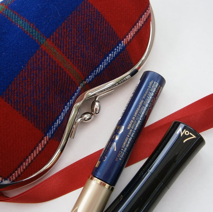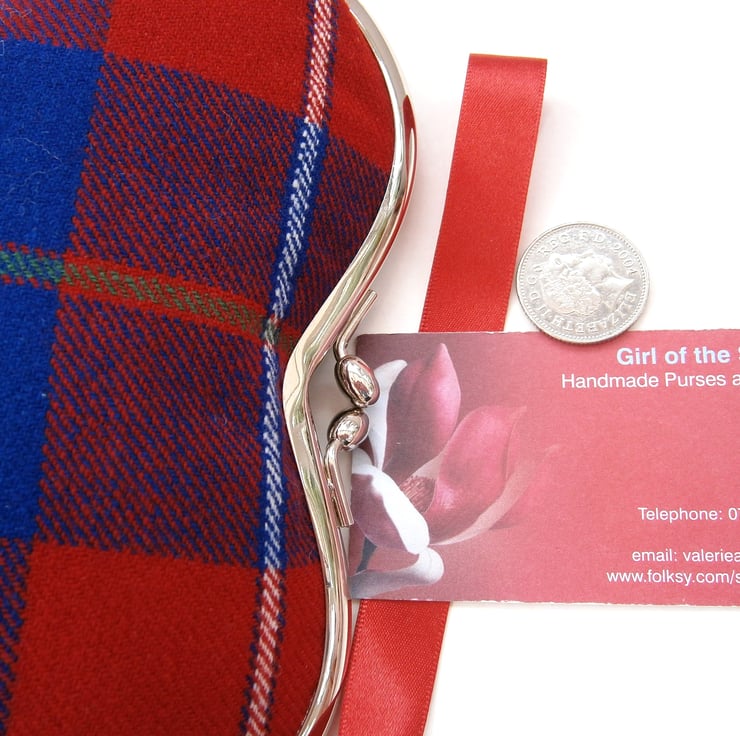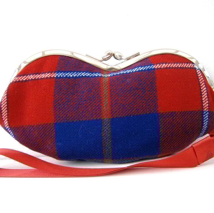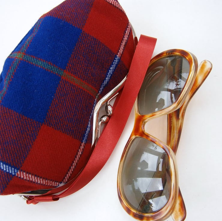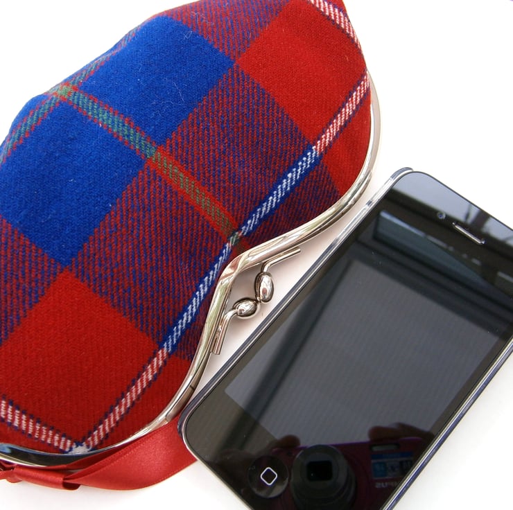 Charming little wristlet purse for sunglasses or mobile phone in beautiful Galloway tartan fabric with contrasting lining and removable wrist strap. Measures approx 7x3.5