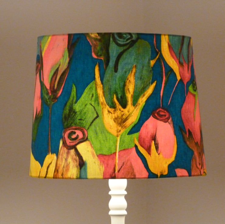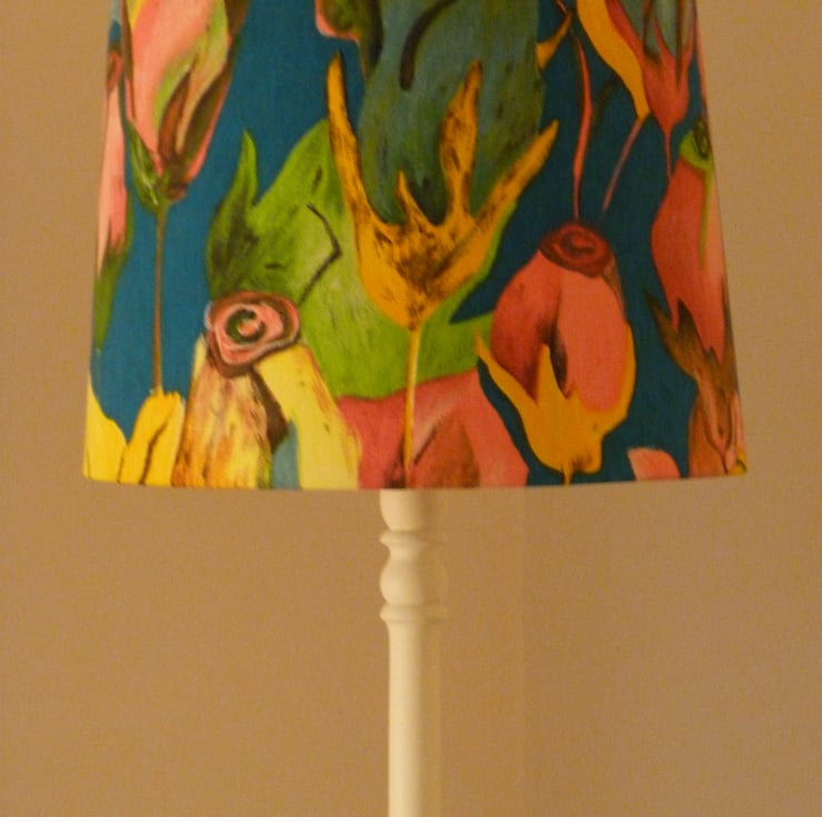 The colours in this fabric are wild and wonderful. The shade is a slightly tapered drum and is suitable for a standard lamp.