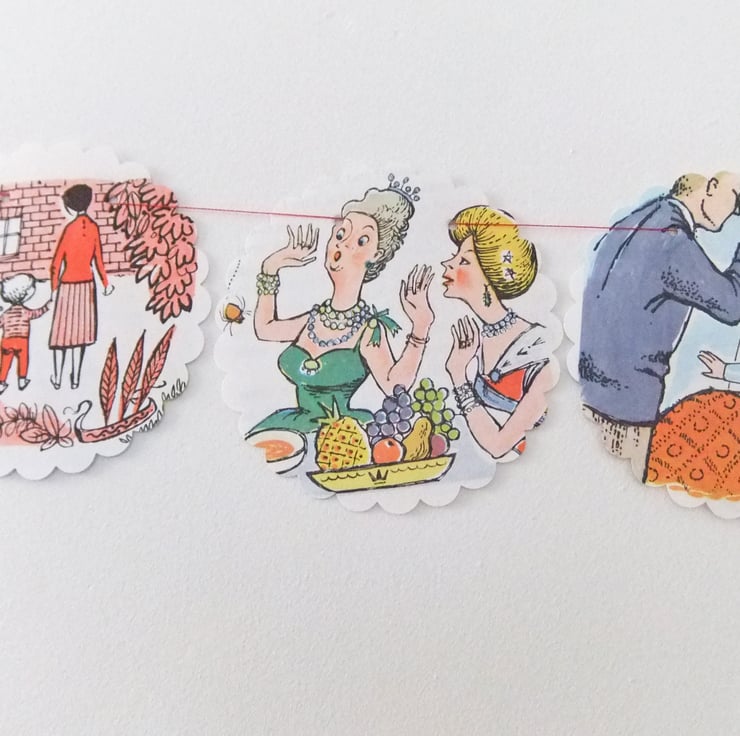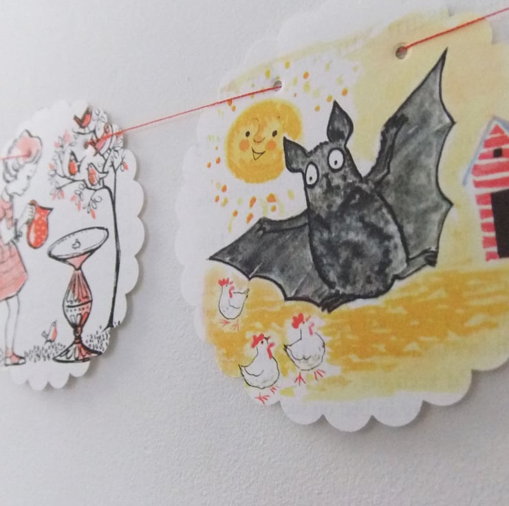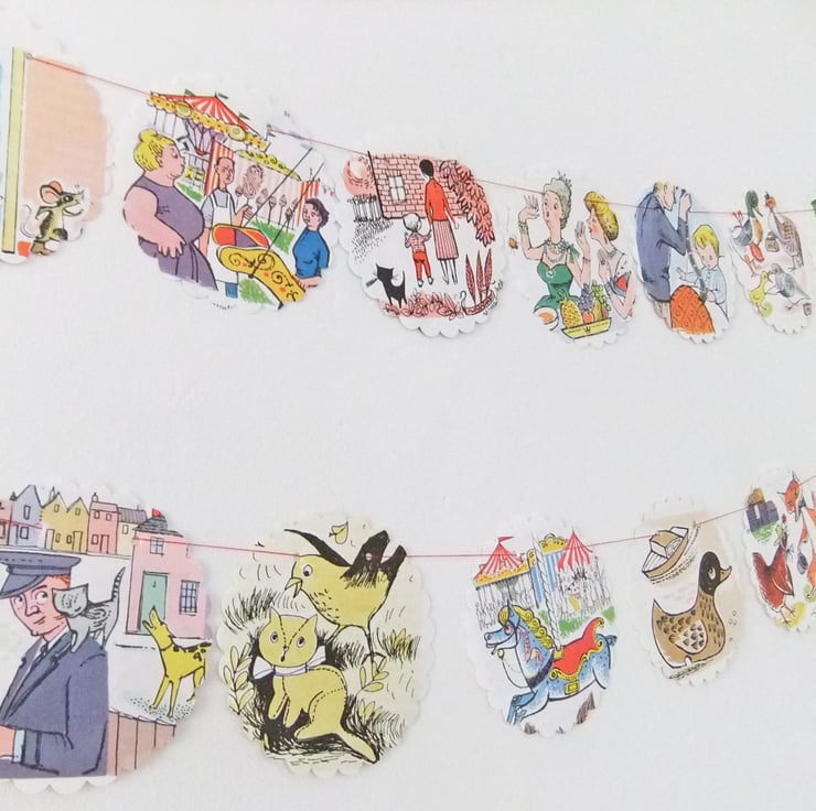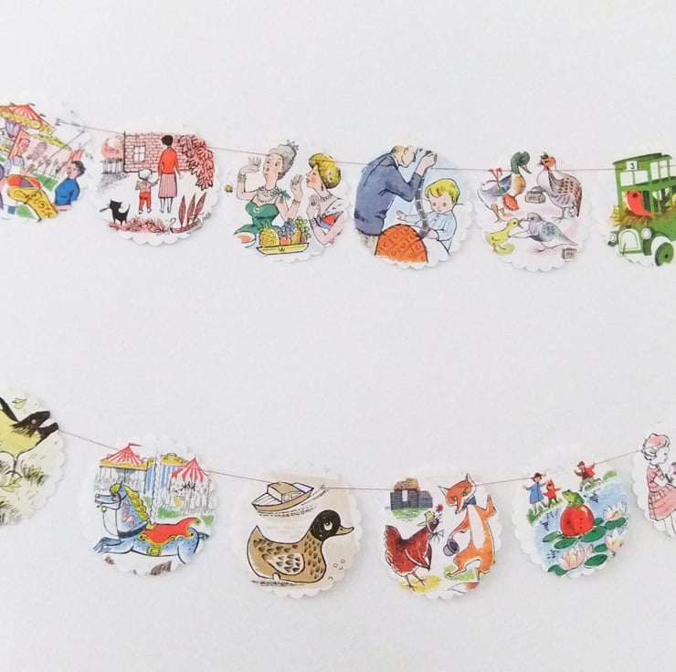 This listing is for ONE garland of bunting with 9 scalloped circle flags. Each flag has a wonderful colour illustration.
