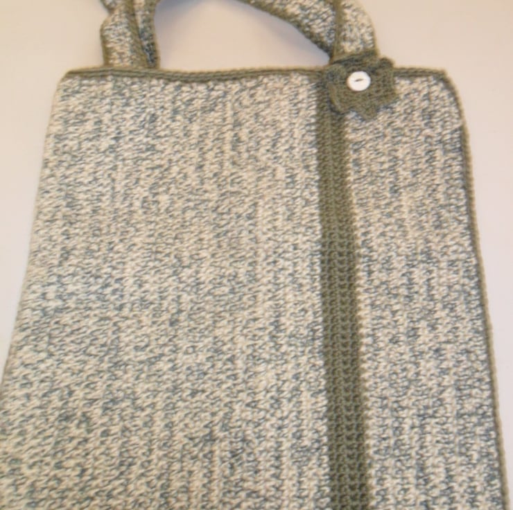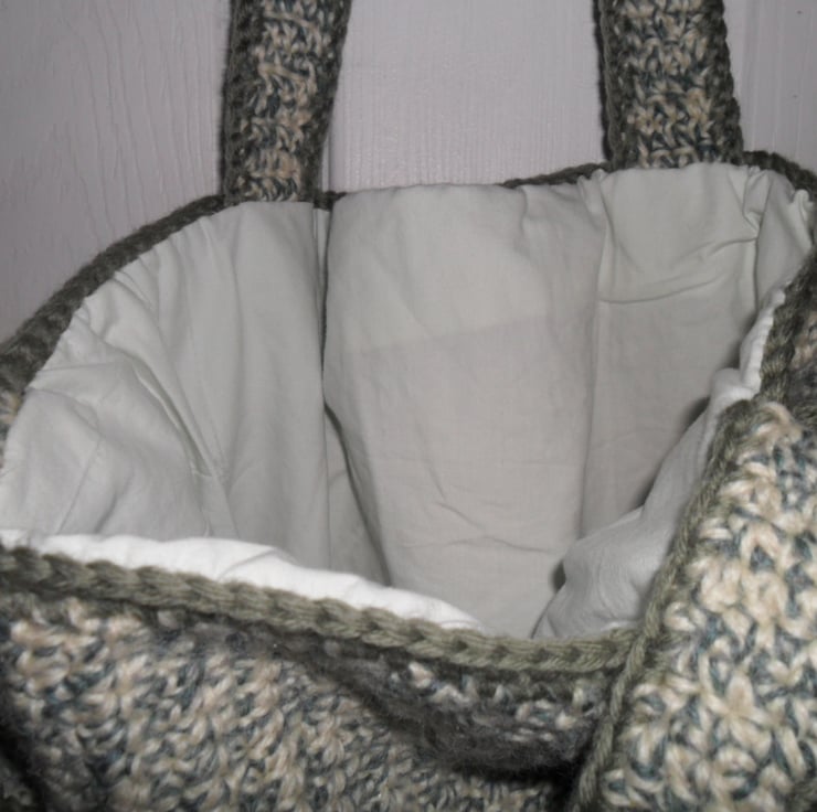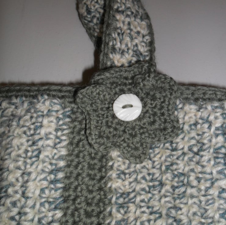 The shoulder bag has been crocheted mainly in green and white wool and acrylic mixed yarn with a thin green stripe. I then continued to edge and frame the bag with the same green yarn.