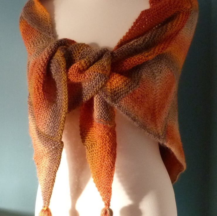 This beautiful triangular shawl measures 61” point to point, and 26” deep. I designed and hand knit the shawl in King Cole Riot DK (30% wool, 70% acrylic). I have also handmade the tassels to complete the shawl. The finished garment weight is 250g approximately.