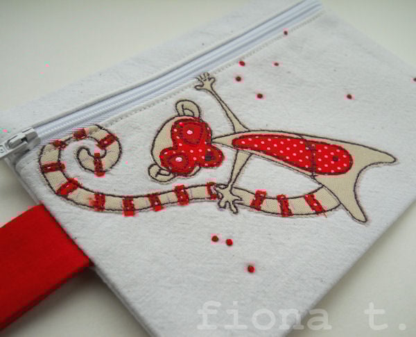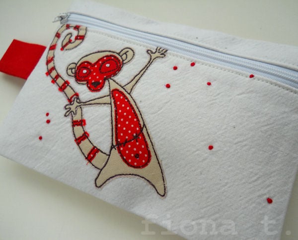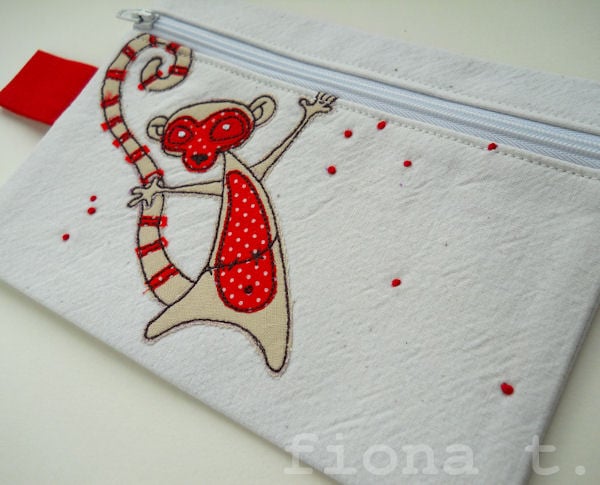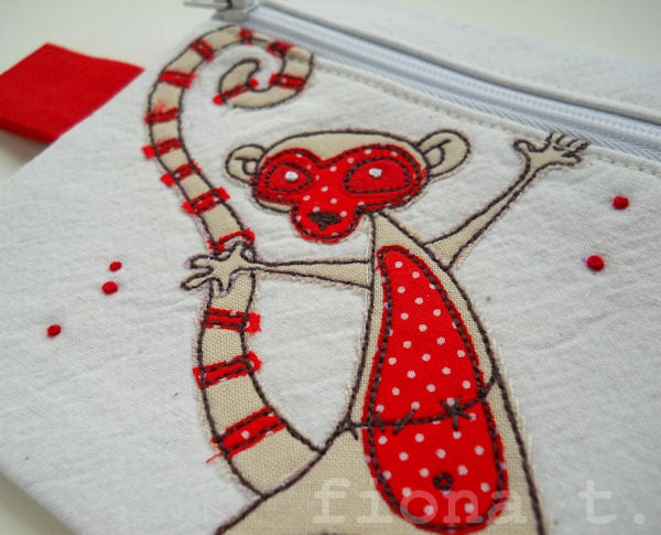 it features an appliqued and embroidered angry sunburnt zombie lemur on the front, in cream & tiny red polka dot fabrics.