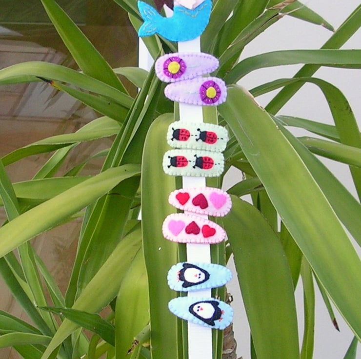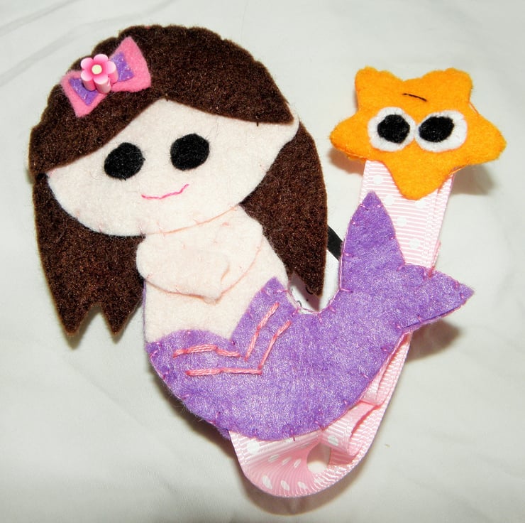 This lovely wee mermaid is a fabulous way to store your hair accessories. She is made from felt and ribbon, and has a loop at the top so she can be hung up or pinned to the wall.