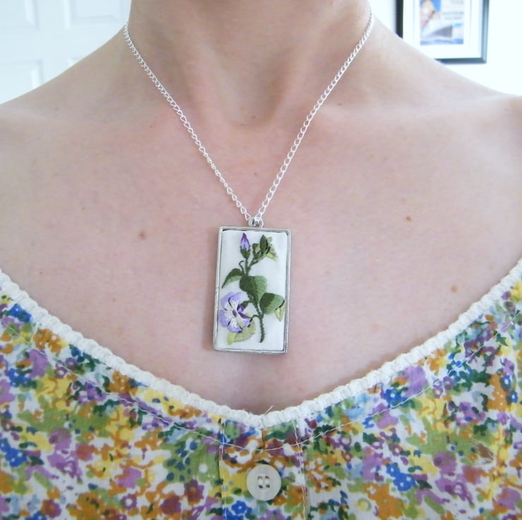 This pendant depicts a Periwinkle flower and stem. It is an original design hand embroidered on silk, mounted in a silver plated frame measuring 24.7mm x 46.2mm. The pendant is hung on a 16" silver plated chain.