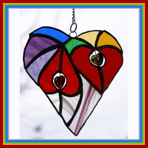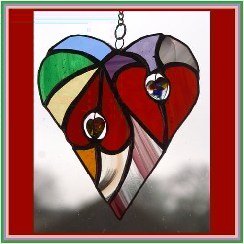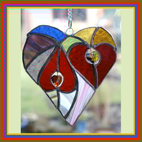 The design is a big heart containing 2 smaller, bright red hearts and these are surrounded by different shades of glass in all the colours of the rainbow. I have also used some very pretty streaky pink, white and cinnamon glass at the bottom of the heart for added effect. Inside each of the two smaller hearts is a gorgeous multi-colour heart bead.
