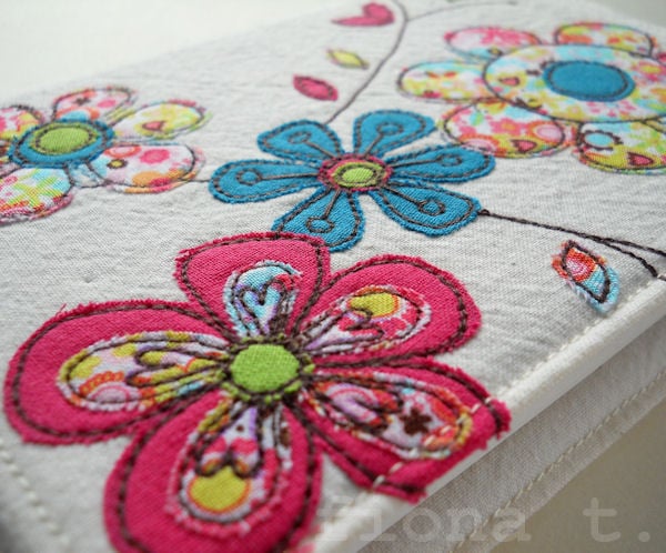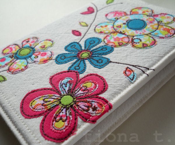 this notebook cover features a spray of pretty flowers, based on one of my own sketches, and is entirely made by me on a domestic sewing machine.