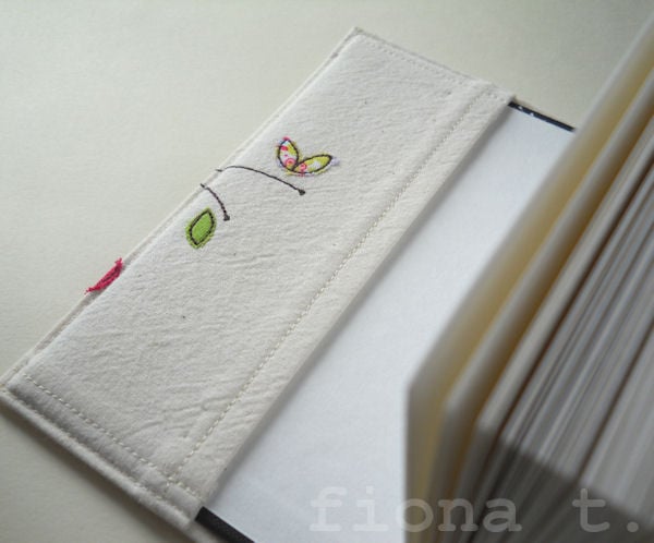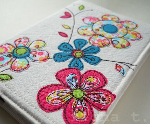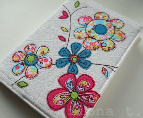 appliqued and embroidered floral fabric notebook cover and A6 sketchbook.
