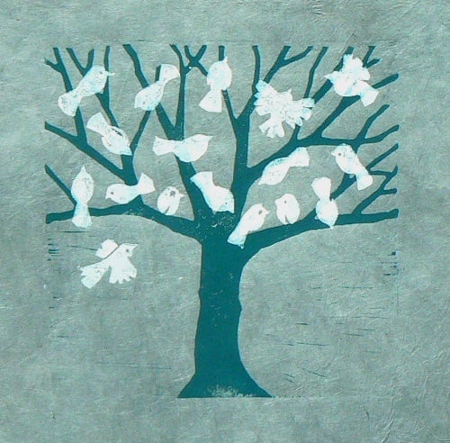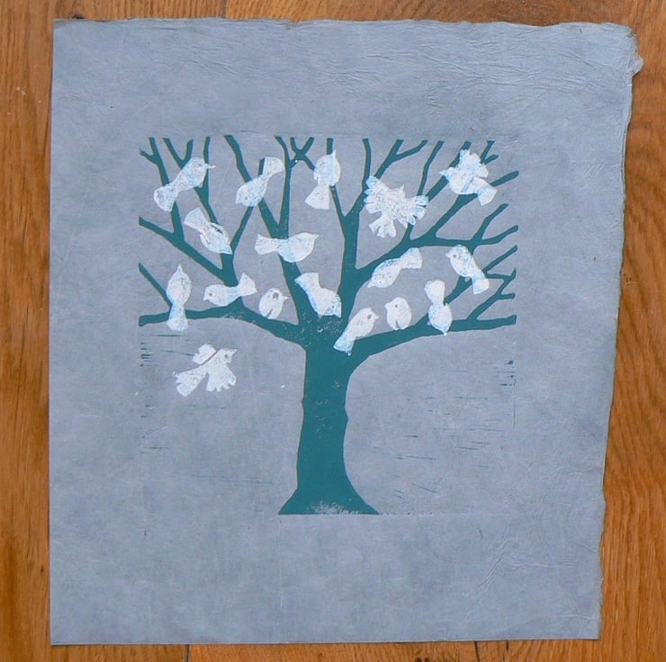 This lino cut is hand printed in two layers, on handmade paper, which is dyed a soft blue grey.